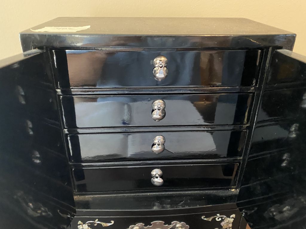 Mother of Pearl Style Black Lacquer Jewelry Cabinet, two door with interior drawers, 8"w., 10"h.Location Upstairs Bedroom 1 Mother of Pearl Style Black Lacquer Jewelry Cabinet, two door with interior drawers, 8"w., 10"h.Location Upstairs Bedroom 1