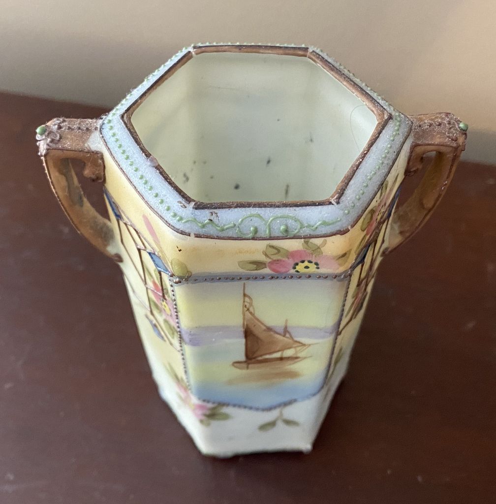 Hand Painted Nippon Vase, handled vase, sailboat, vintage, 5"h, Location Upstairs Bedroom 1 Hand Painted Nippon Vase, handled vase, sailboat, vintage, 5"h, Location Upstairs Bedroom 1