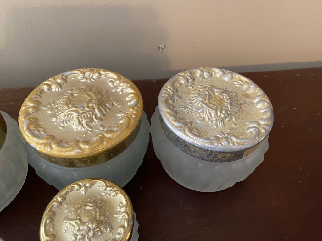 Group of Glass Powder Jars, brass caps, Location Upstairs Bedroom 1 Group of Glass Powder Jars, brass caps, Location Upstairs Bedroom 1