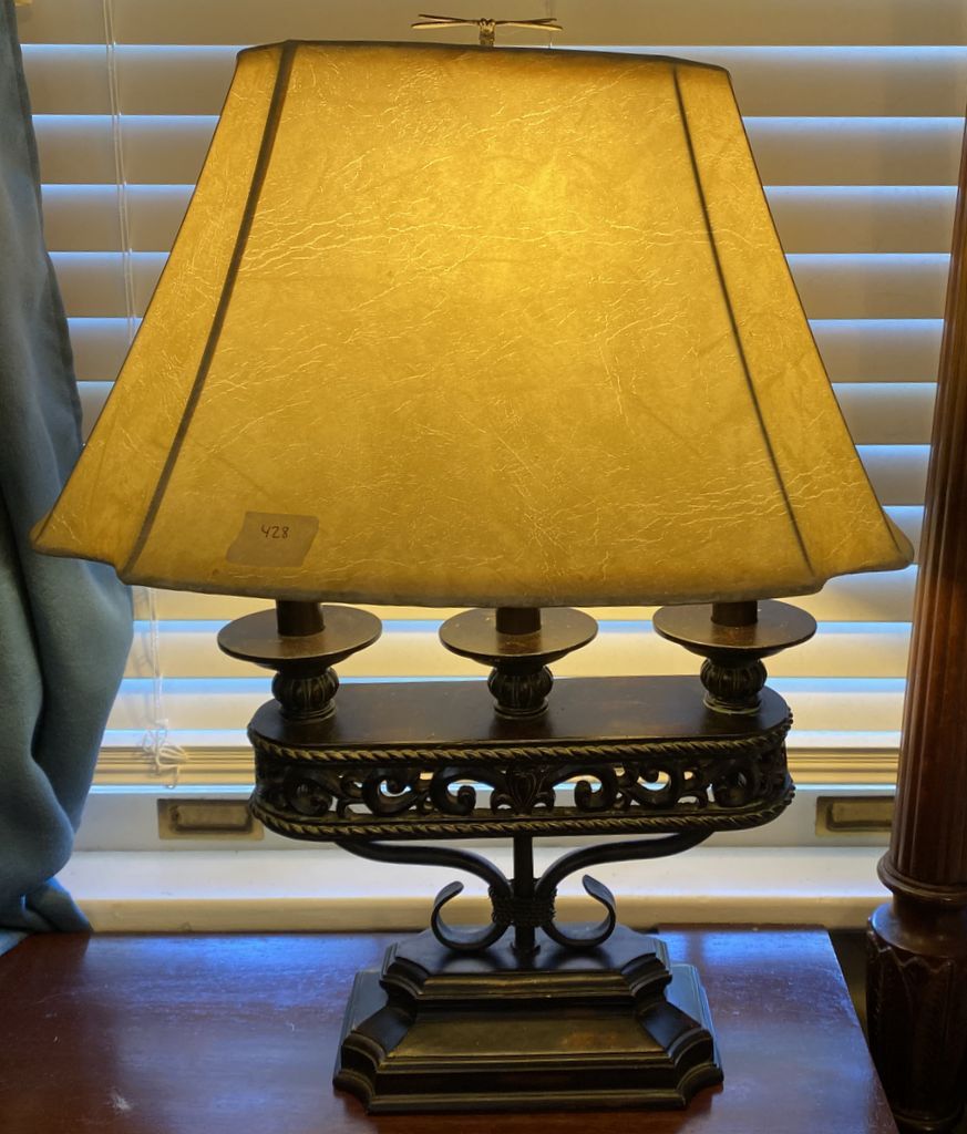 Modern Three Slot Candle Stick Lamp, with shade, measures 24"h., Location Upstairs Bedroom 1 Modern Three Slot Candle Stick Lamp, with shade, measures 24"h., Location Upstairs Bedroom 1
