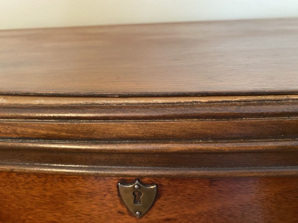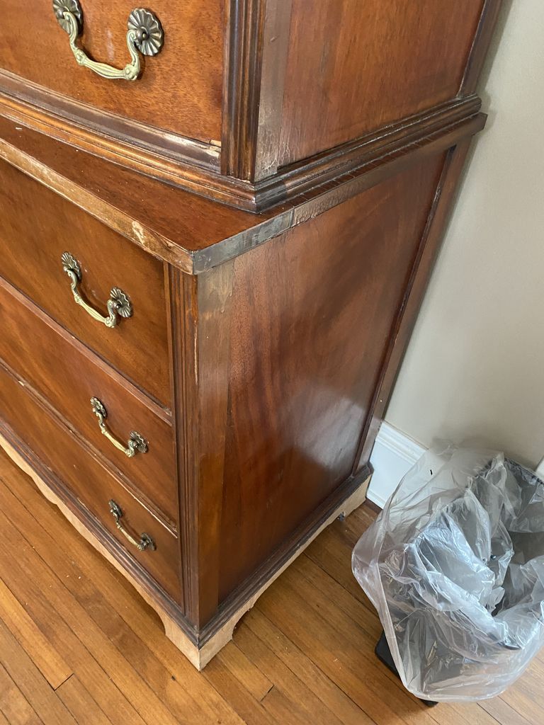 Vintage Mahogany Traditional Style Chest on Chest, base veneer missing, top veneer loose, 58"h., 33"w. 20"d. Location Upstairs Bedroom 1 Vintage Mahogany Traditional Style Chest on Chest, base veneer missing, top veneer loose, 58"h., 33"w. 20"d. Location Upstairs Bedroom 1