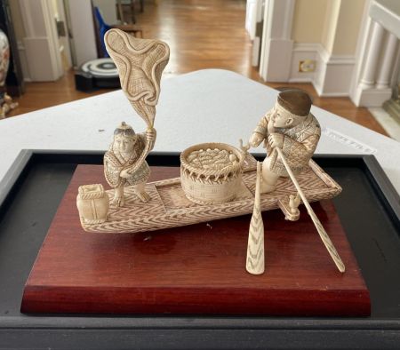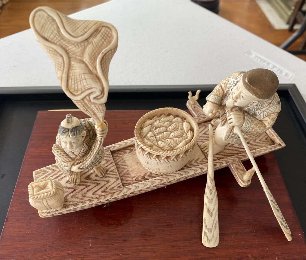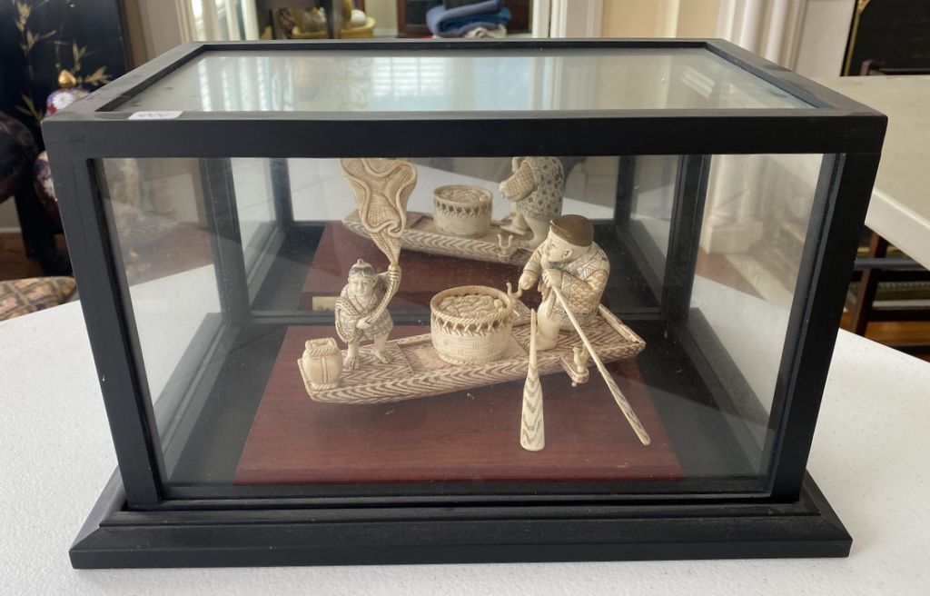 Japanese Carved Netsuke Style Figurines, in glass case, 13"h., 8"w. Location Living Room1 Japanese Carved Netsuke Style Figurines, in glass case, 13"h., 8"w. Location Living Room1