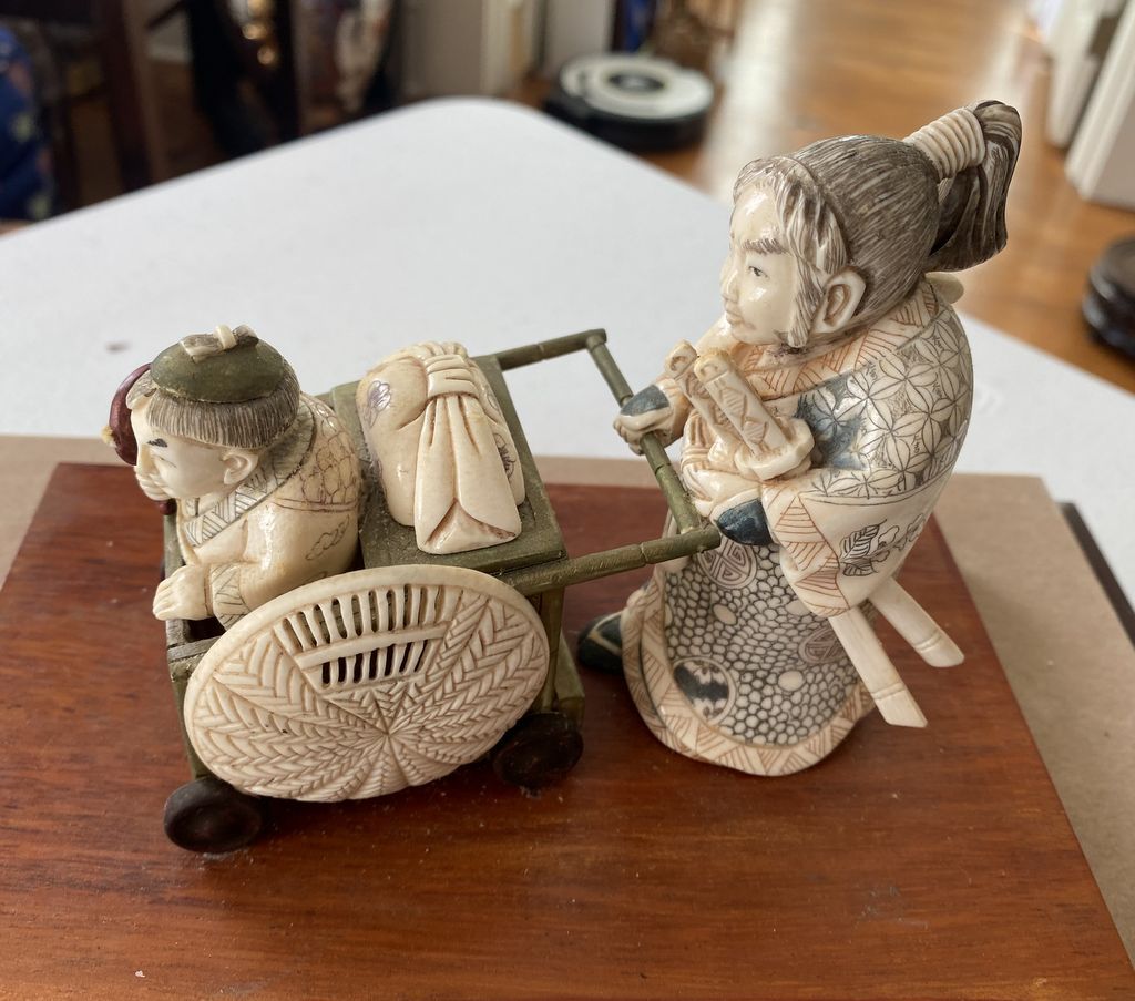 Japanese Carved Netsuke Style Figurines, in glass case, 13"h., 8"w. Location Living Room1 Japanese Carved Netsuke Style Figurines, in glass case, 13"h., 8"w. Location Living Room1
