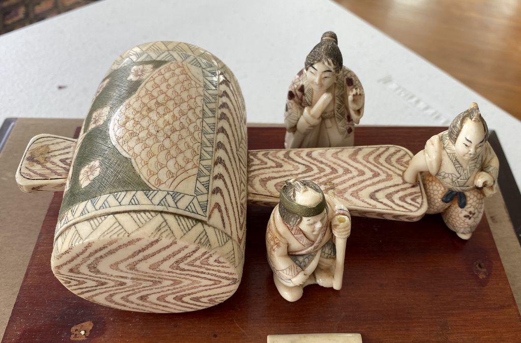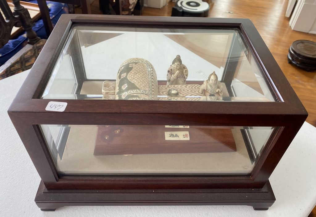 Japanese Carved Netsuke Style Figurines, in glass case, 13"h., 8"w. Location Living Room1 Japanese Carved Netsuke Style Figurines, in glass case, 13"h., 8"w. Location Living Room1