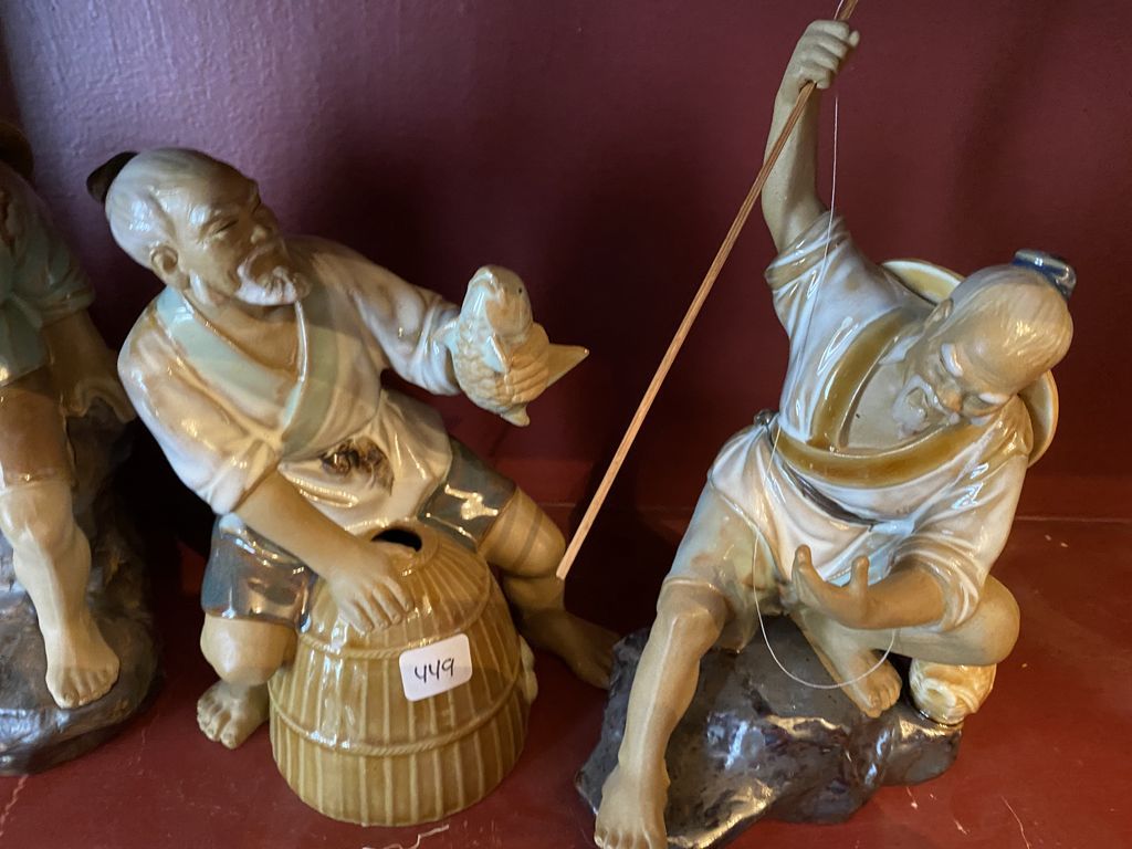 Four Shiwan Mudman Chinese Fisherman Figurines, one needs repair, 7"h, Location Library, Four Shiwan Mudman Chinese Fisherman Figurines, one needs repair, 7"h, Location Library,