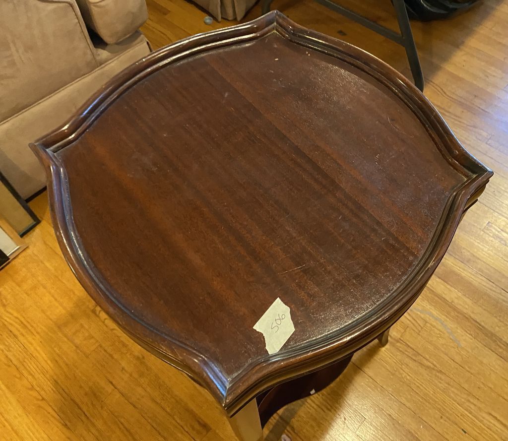 Mahogany Three Tier End Table, Light Wear, 27"h., 17"w. Location Living Room 2 Mahogany Three Tier End Table, Light Wear, 27"h., 17"w. Location Living Room 2