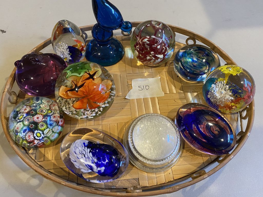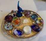 Group of Art Glass Paper Weights, blue bird figurine, tray included, Location Living Room 2 Group of Art Glass Paper Weights, blue bird figurine, tray included, Location Living Room 2