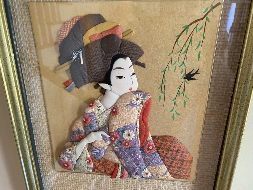 Vintage Japanese Quilted Geisha 3d Shadowbox, frame is 17"h,. 13"w. Location Stairs Vintage Japanese Quilted Geisha 3d Shadowbox, frame is 17"h,. 13"w. Location Stairs