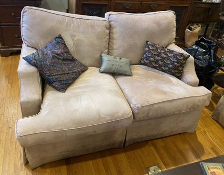 Suede Style Upholstered Two Cushion Love Seat, 58"w. Location Living Room 2 Suede Style Upholstered Two Cushion Love Seat, 58"w. Location Living Room 2