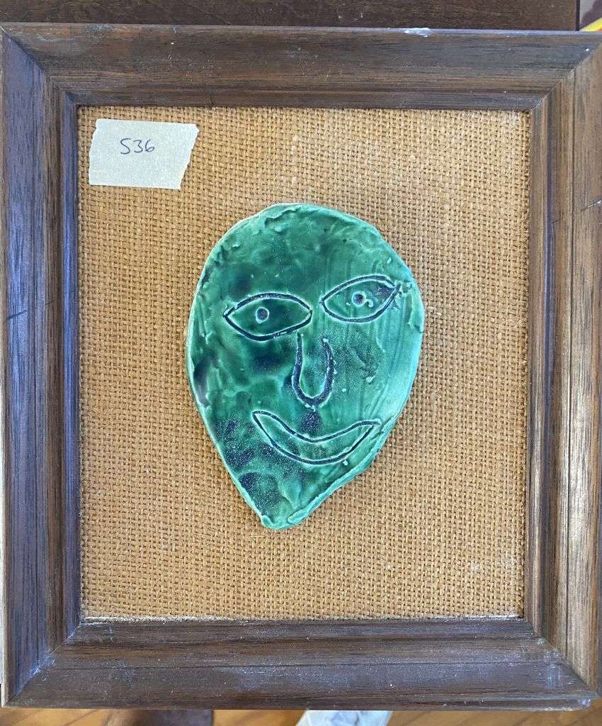 Hand Crafted Framed Pottery Face, 10"h. ,9"w. Location Living Room 1 Hand Crafted Framed Pottery Face, 10"h. ,9"w. Location Living Room 1