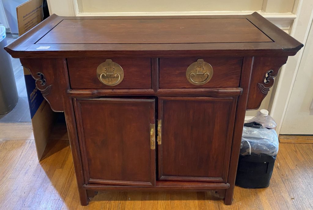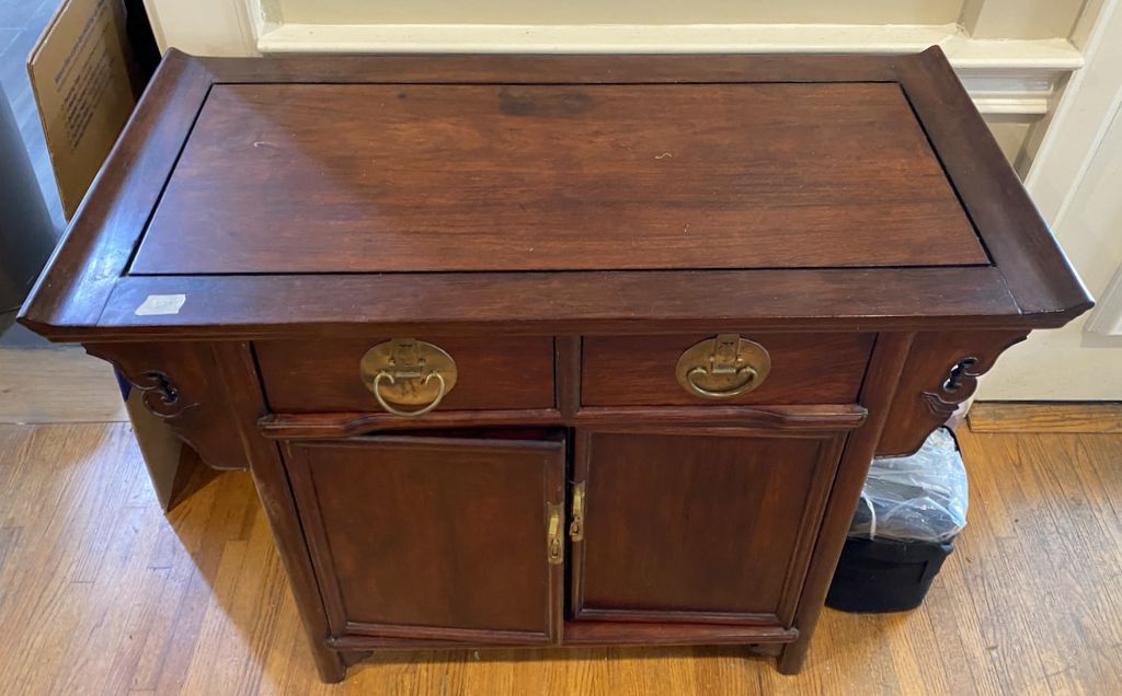 Mid Century Ming Style Console Cabinet, two doors, two drawers, good condition, 32"h., 39"w., Location Living Room 2 Mid Century Ming Style Console Cabinet, two doors, two drawers, good condition, 32"h., 39"w., Location Living Room 2