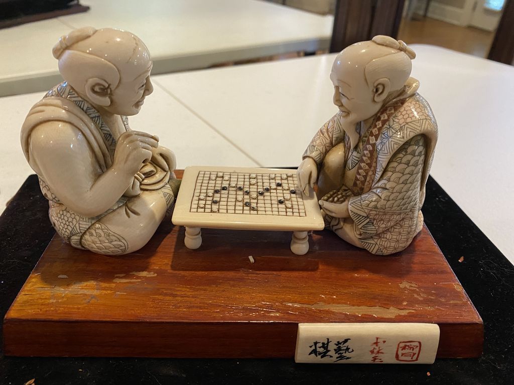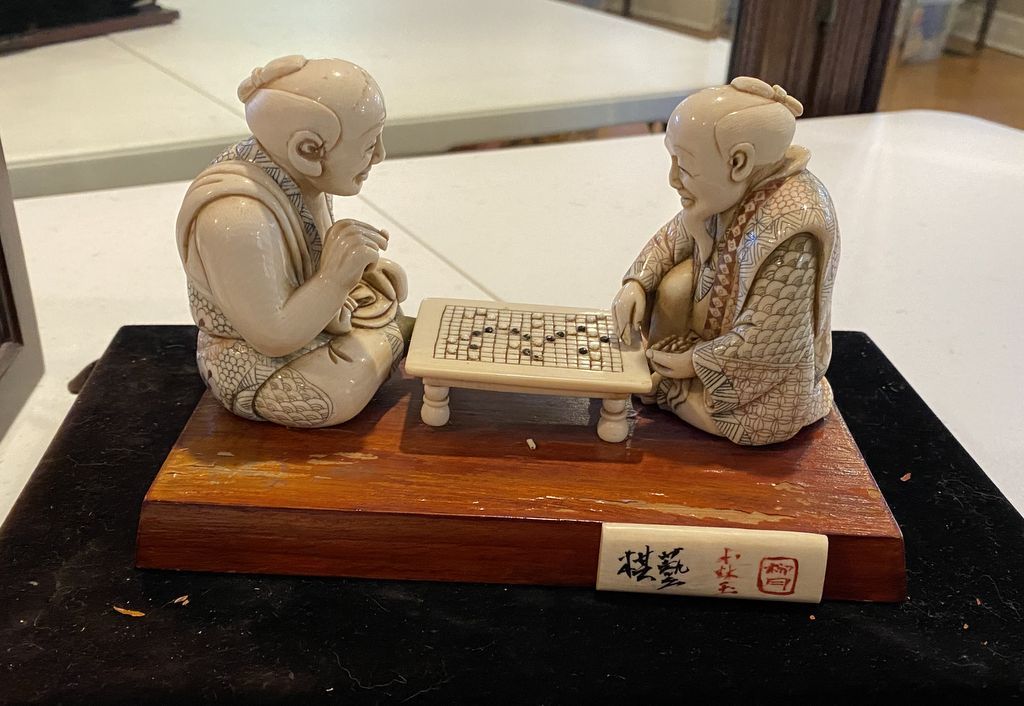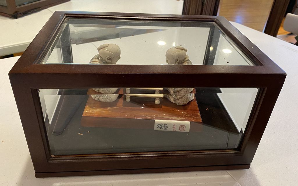 Japanese Carved Netsuke Style Gaming Player Figurines, displayed in glass case, Location Living Room 2 Japanese Carved Netsuke Style Gaming Player Figurines, displayed in glass case, Location Living Room 2