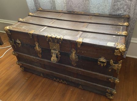 Antique Wood Streamer Trunk, brass accent trim, paper lining, with tray, 20"h., 36"w. Location Bedroom 3 Antique Wood Streamer Trunk, brass accent trim, paper lining, with tray, 20"h., 36"w. Location Bedroom 3