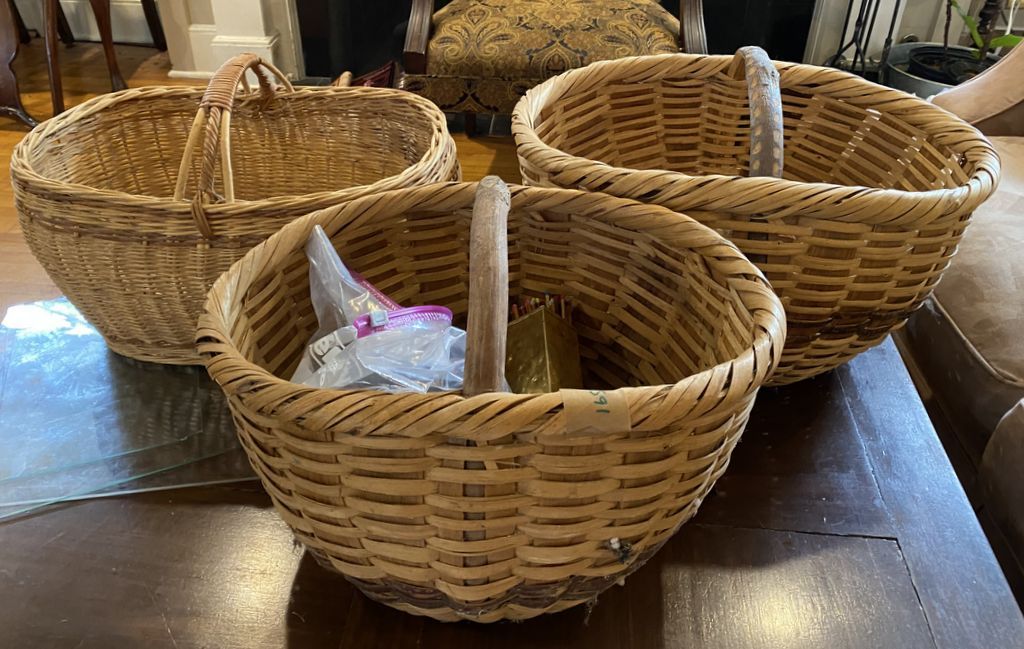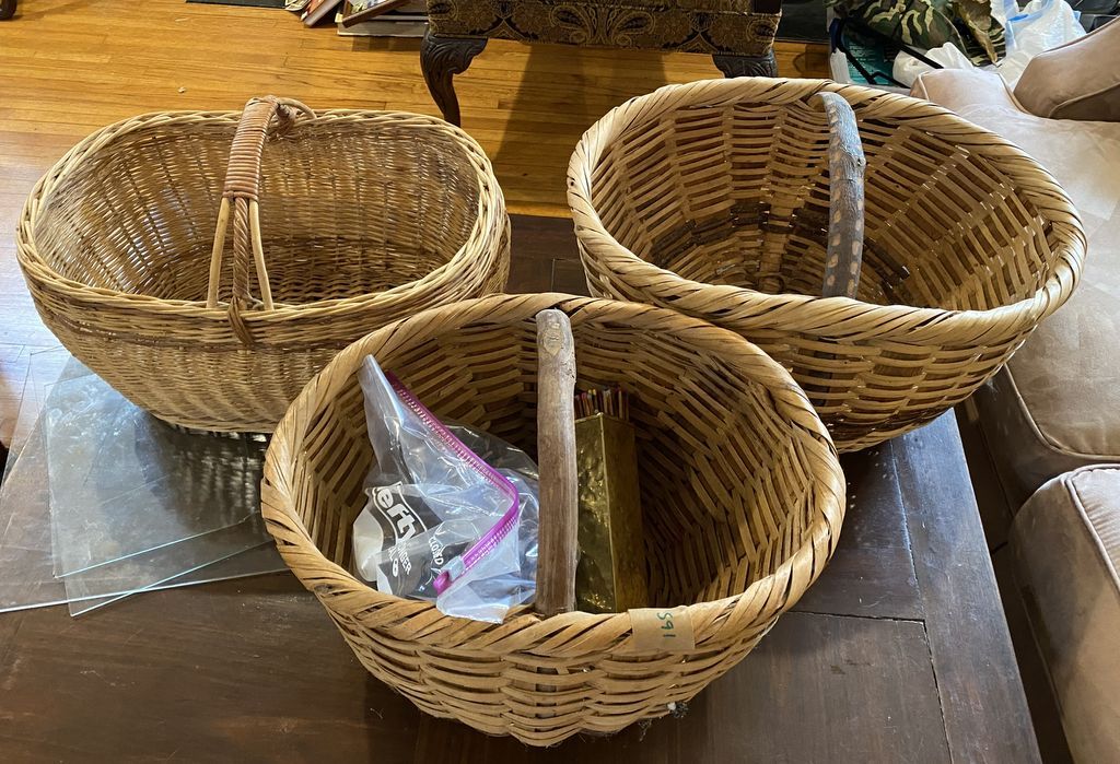Three Decorative Large Weaved Carrying Baskets, wood handles, Location Living Room 2 Three Decorative Large Weaved Carrying Baskets, wood handles, Location Living Room 2