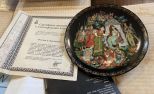 Group of Russian Collector Plate, each different themes and stories in Russia, box lot with original boxes. 1989 This plate number 6265B is the only official work by artist Vladimir Vlezko who created it based on Pushkin’s verse – The tale of the Golden Cockerel. The artist created this original work specifically for this collection (of Pushkin’s works) using traditional miniature print of famous Paleha, implementing all traditional colors and with use of real gold. This plate is a 3rd edition of Russian fairytales collectable plates, which were produced in Vinogradovky china factory in Soviet Union Group of Russian Collector Plate, each different themes and stories in Russia, box lot with original boxes. 1989 This plate number 6265B is the only official work by artist Vladimir Vlezko who created it based on Pushkin’s verse – The tale of the Golden Cockerel. The artist created this original work specifically for this collection (of Pushkin’s works) using traditional miniature print of famous Paleha, implementing all traditional colors and with use of real gold. This plate is a 3rd edition of Russian fairytales collectable plates, which were produced in Vinogradovky china factory in Soviet Union