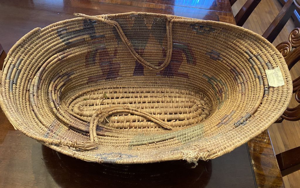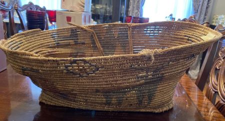 Vintage Native American Carrying Produce Basket, has age wear and damaged areas. 21"w, Location Dining Room Vintage Native American Carrying Produce Basket, has age wear and damaged areas. 21"w, Location Dining Room