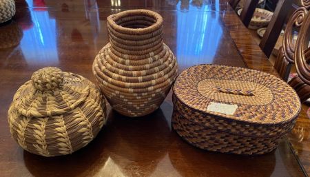 Native American Pine Needle Baskets and Woven Vase, Location Dining Room Native American Pine Needle Baskets and Woven Vase, Location Dining Room