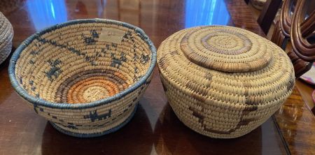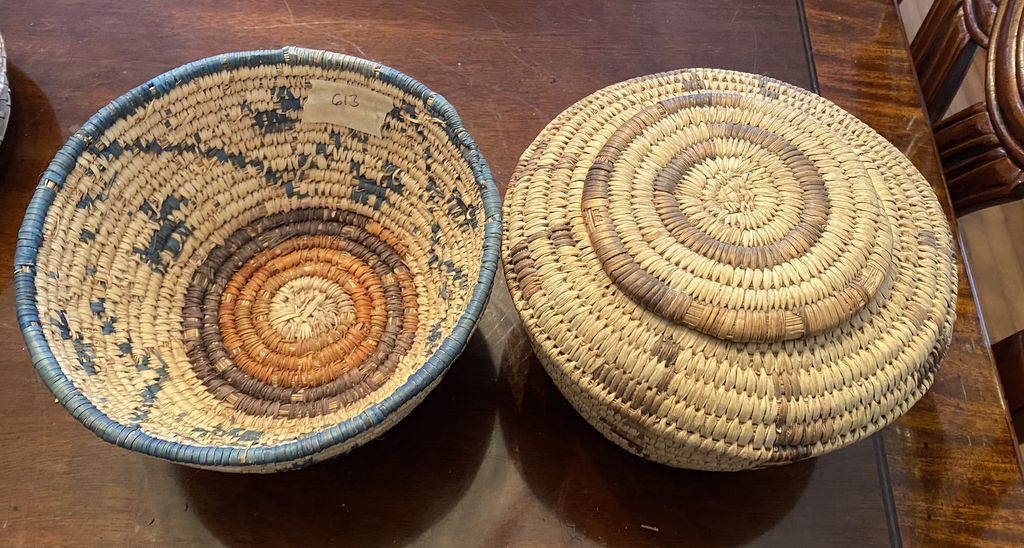 Two Hand Woven African Tribal Bowl and Covered Basket, Location Dining Room Two Hand Woven African Tribal Bowl and Covered Basket, Location Dining Room