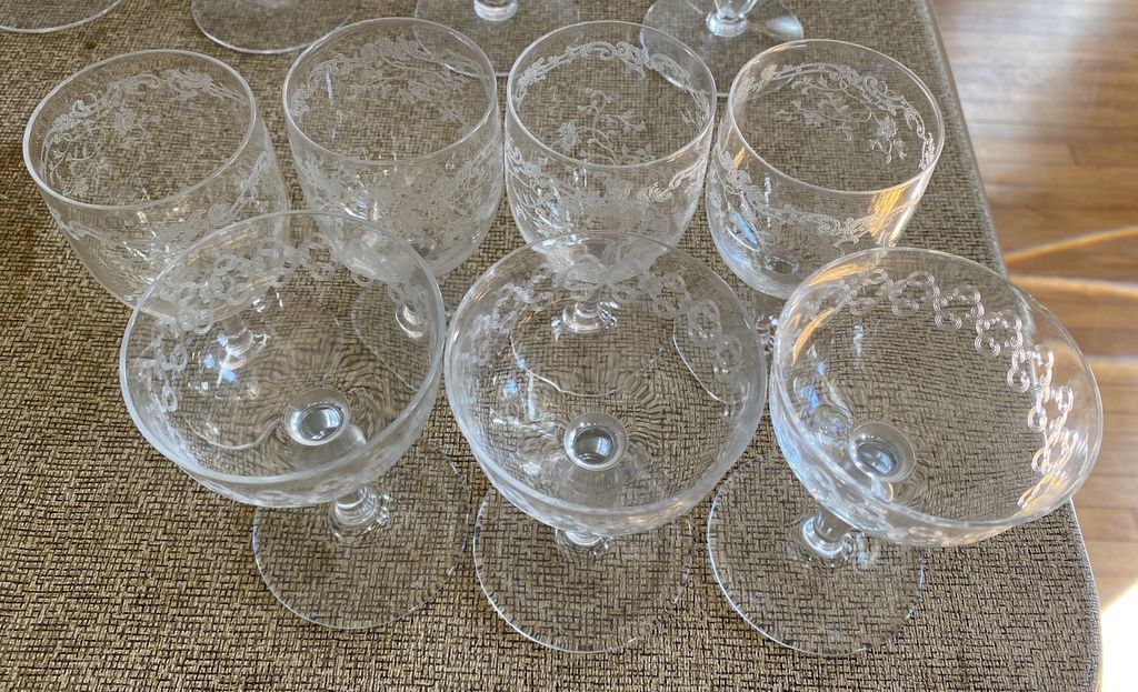 7 Vintage Etched Crystal Glassware, wine glasses, four match, 3 match, Location Foyer 7 Vintage Etched Crystal Glassware, wine glasses, four match, 3 match, Location Foyer