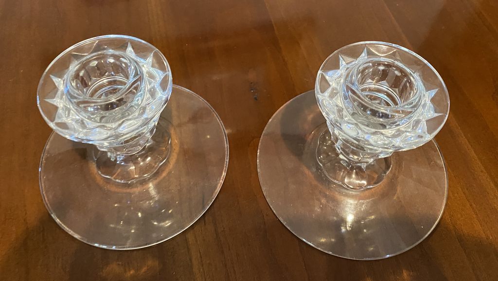 Pair of Fostoria American Clear Candle Holders, 3 1/2"h, Location Hall by Kitchen Pair of Fostoria American Clear Candle Holders, 3 1/2"h, Location Hall by Kitchen