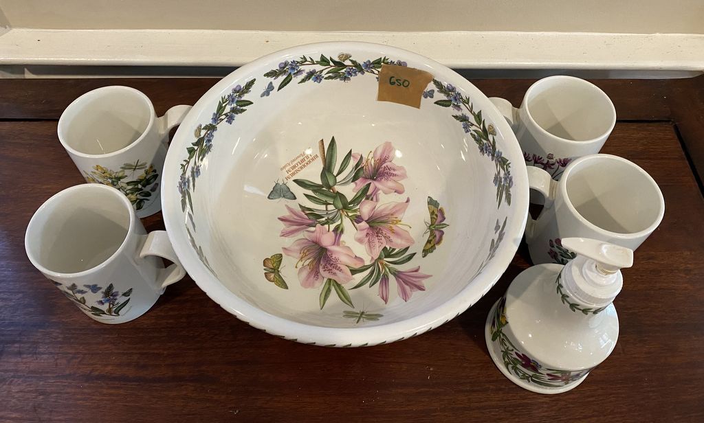 Botanica Garden Pattern Portmeirion Botanic Garden, "Lily Flowered Azalea" Bowl, Dispenser, and Mugs, Location Living Room 2 Botanica Garden Pattern Portmeirion Botanic Garden, "Lily Flowered Azalea" Bowl, Dispenser, and Mugs, Location Living Room 2
