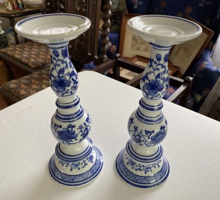 Pair of Porcelain Blue and White Candle Holders, 11"h, Location Living Room 1 Pair of Porcelain Blue and White Candle Holders, 11"h, Location Living Room 1