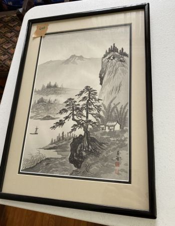 Framed Asian Landscape Block Print, matted, frame is 20"h., 14"w. Location Room 1 Framed Asian Landscape Block Print, matted, frame is 20"h., 14"w. Location Room 1