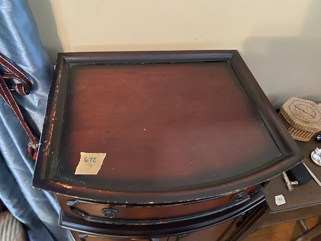 Modern Cherry Jewelry Armoire, two door with interior drawers lined with felt, top storage, light wear, 39"h., 18"w. Location Bedroom 1 Modern Cherry Jewelry Armoire, two door with interior drawers lined with felt, top storage, light wear, 39"h., 18"w. Location Bedroom 1