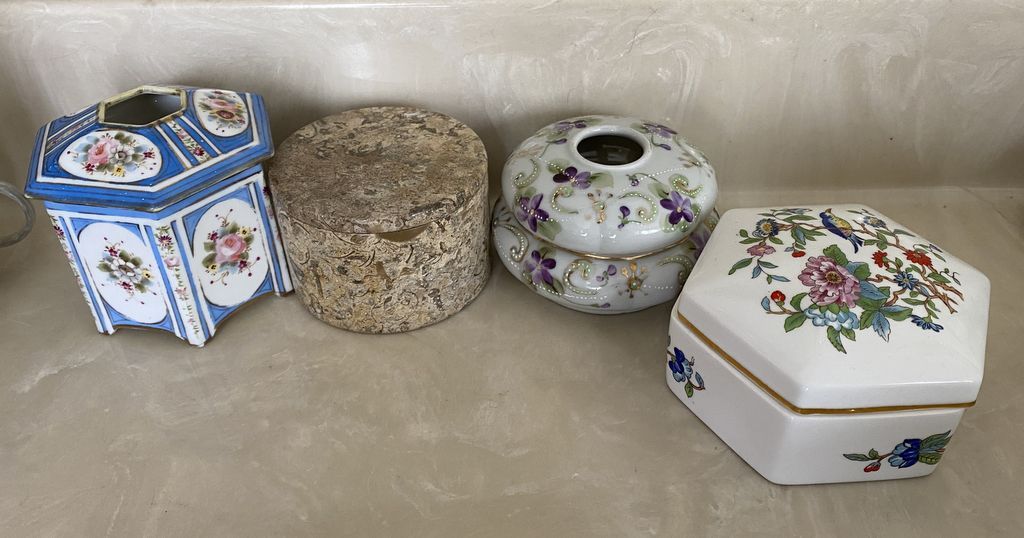 Two Porcelain Hair Receivers and Two Powder Boxes, porcelain hand painted, Location Bedroom 1 Bathroom Two Porcelain Hair Receivers and Two Powder Boxes, porcelain hand painted, Location Bedroom 1 Bathroom