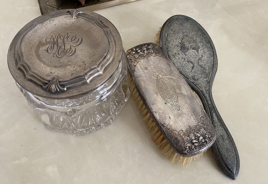 Sterling Lid Glass Powder, Silver Plate Brushes, Location Bedroom 1 Bathroom Sterling Lid Glass Powder, Silver Plate Brushes, Location Bedroom 1 Bathroom