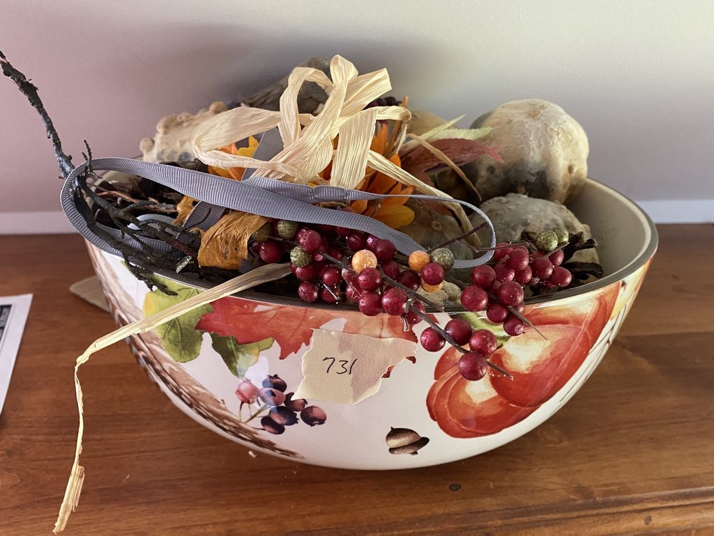 Round Porcelain Center Bowl, with faux fruit, 12"dia, Location Attic Round Porcelain Center Bowl, with faux fruit, 12"dia, Location Attic