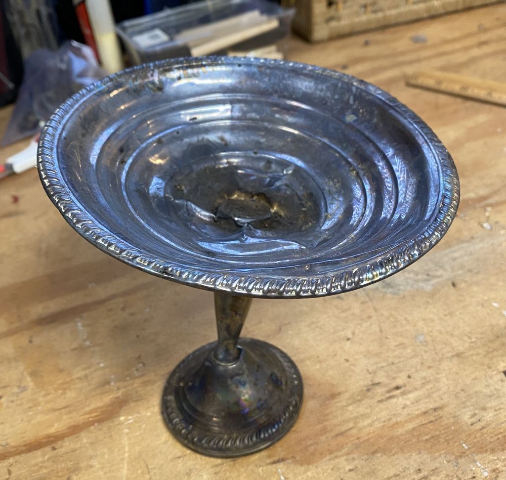 Weighted Sterling Compote, tarnish, bent and damage, Location Shop Weighted Sterling Compote, tarnish, bent and damage, Location Shop