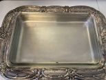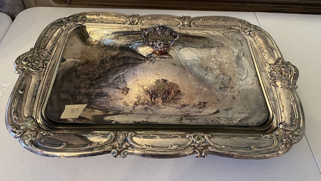 Silver Plate Glass lined Serving Dish, light tarnish, 19"w. Location Dining Room Silver Plate Glass lined Serving Dish, light tarnish, 19"w. Location Dining Room