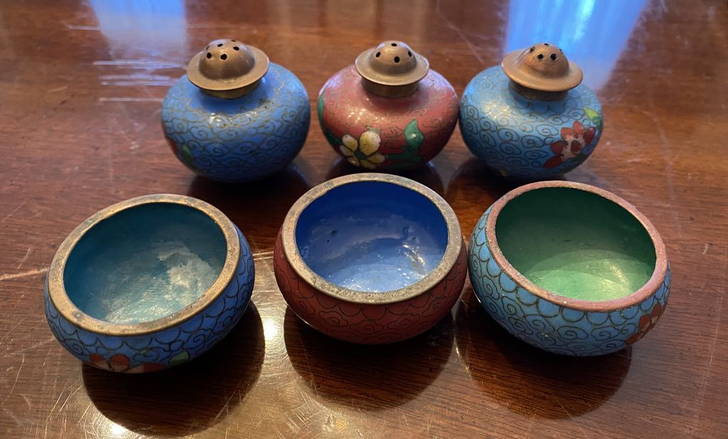 Three Cloisonné Salt and Pepper, and Salt Bowls, 1 1/2"h, Location Dining Room Three Cloisonné Salt and Pepper, and Salt Bowls, 1 1/2"h, Location Dining Room
