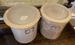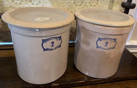 Pair of Marshall Pottery Lidded Crock, label 2 gallon, one lid has chip, 10"h., 10"dia, Location Living room 2 Pair of Marshall Pottery Lidded Crock, label 2 gallon, one lid has chip, 10"h., 10"dia, Location Living room 2