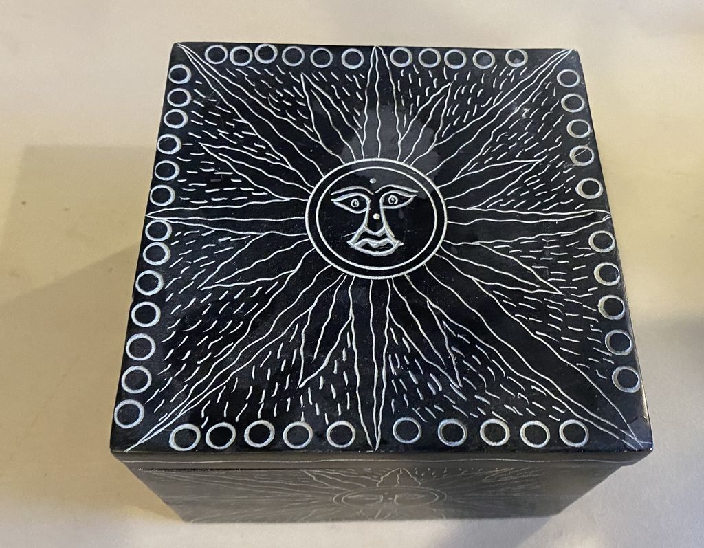 Black Soapstone Sun Box, etched Sunburst, with lid, 5"w, Location Living Room 2 Black Soapstone Sun Box, etched Sunburst, with lid, 5"w, Location Living Room 2