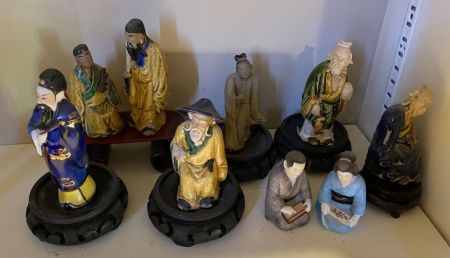 Group of Chinese Mudmen Pottery Figurines, hand crafted, hand painted, some with bases, Location Living Room 2 Group of Chinese Mudmen Pottery Figurines, hand crafted, hand painted, some with bases, Location Living Room 2