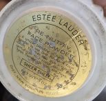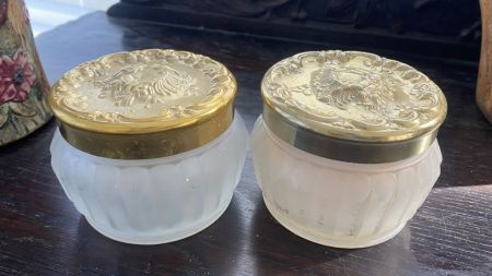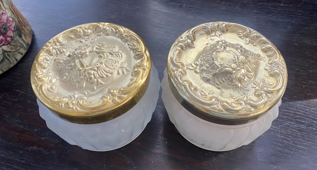 Pair of Vintage Glass Powder Jars, brass lids, Location Sunroom Pair of Vintage Glass Powder Jars, brass lids, Location Sunroom
