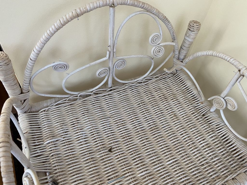 Three Tier White Wicker Stand, has worn wears, 28"h, Location Sunroom Three Tier White Wicker Stand, has worn wears, 28"h, Location Sunroom