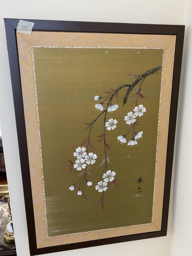 Framed Chinese Dogwood Painting on Silk, has wear, 23"h., 16"w, Location Sunroom Framed Chinese Dogwood Painting on Silk, has wear, 23"h., 16"w, Location Sunroom