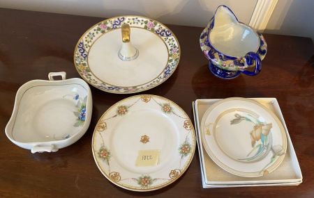 Group of porcelain hand painted pieces, creamer pitcher, Nippon serving plate, bowls, and dessert plates. Location Dining Room Group of porcelain hand painted pieces, creamer pitcher, Nippon serving plate, bowls, and dessert plates. Location Dining Room