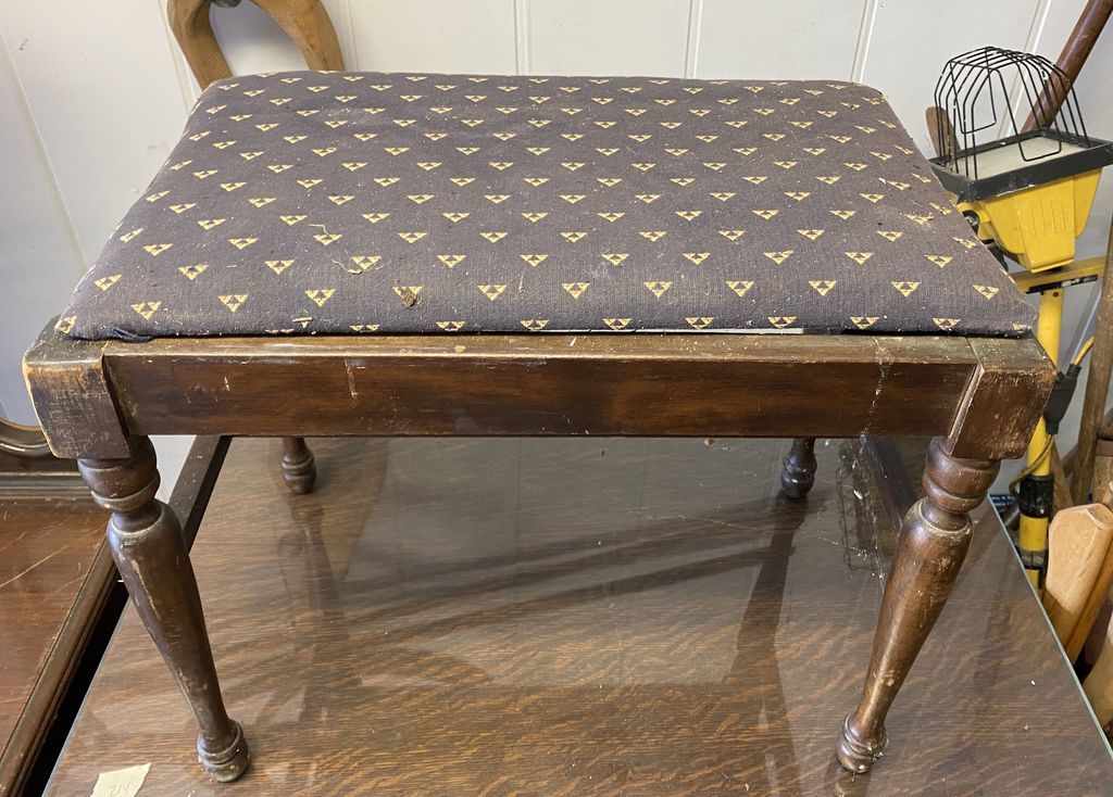 Vintage Mahogany Vanity Stool, 16"h., 21"w, Location Garage Vintage Mahogany Vanity Stool, 16"h., 21"w, Location Garage