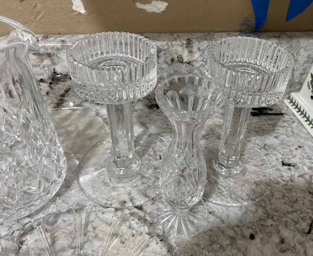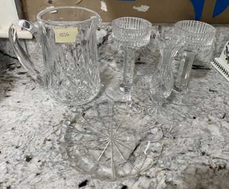 Group of Heavy Glass Serving Pieces, large pitcher, plate, pair of candle holders, and flower vase, Location Kitchen Group of Heavy Glass Serving Pieces, large pitcher, plate, pair of candle holders, and flower vase, Location Kitchen