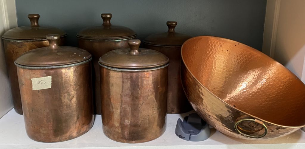 Group of Brass Cannisters and Hammered Brass Bowl, Location Kitchen Group of Brass Cannisters and Hammered Brass Bowl, Location Kitchen