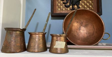 Vintage Etched Turkish Brass Coffee and Bowl , Location Kitchen Vintage Etched Turkish Brass Coffee and Bowl , Location Kitchen