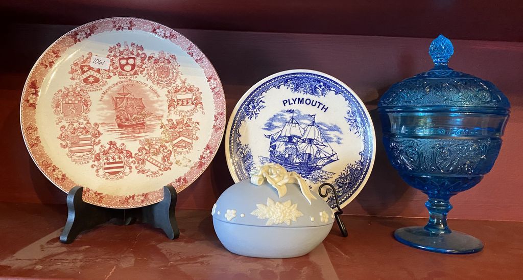 Mayflower and Plymouth Porcelain Plates, Wedgewood Style Egg, Depression Blue Glass Candy, Location Library Mayflower and Plymouth Porcelain Plates, Wedgewood Style Egg, Depression Blue Glass Candy, Location Library