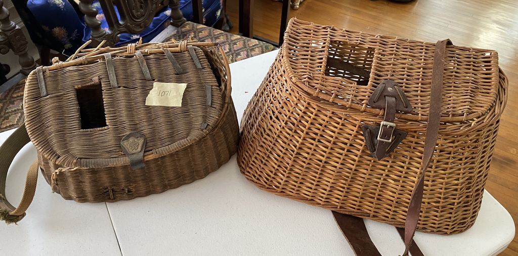 Two Vintage Creel Fishing Baskets, spilt willow creel with leather strap, light wear, Location Library Two Vintage Creel Fishing Baskets, spilt willow creel with leather strap, light wear, Location Library