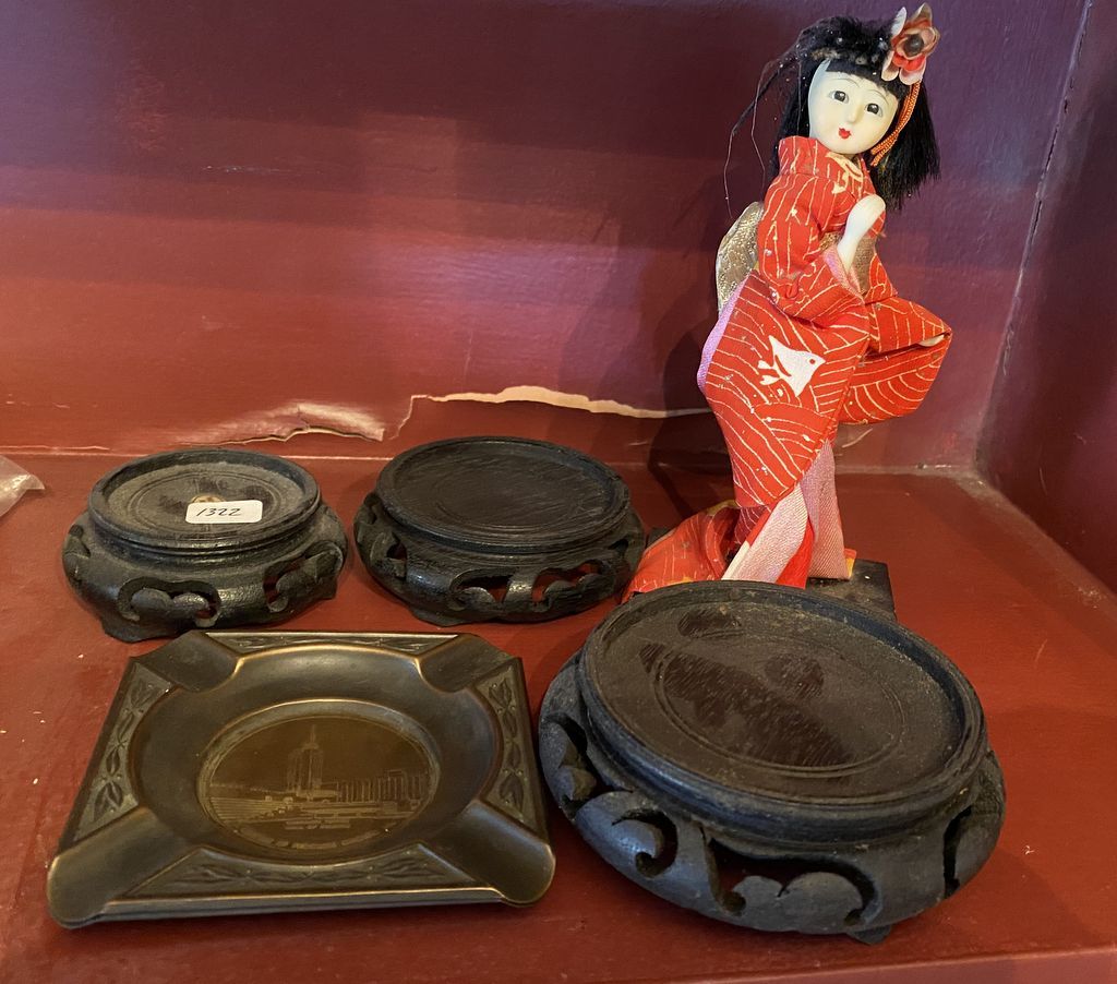 Japanese Kimono Girl Doll, Brass Ashtray, and Three Vase Stands, Location Library Japanese Kimono Girl Doll, Brass Ashtray, and Three Vase Stands, Location Library