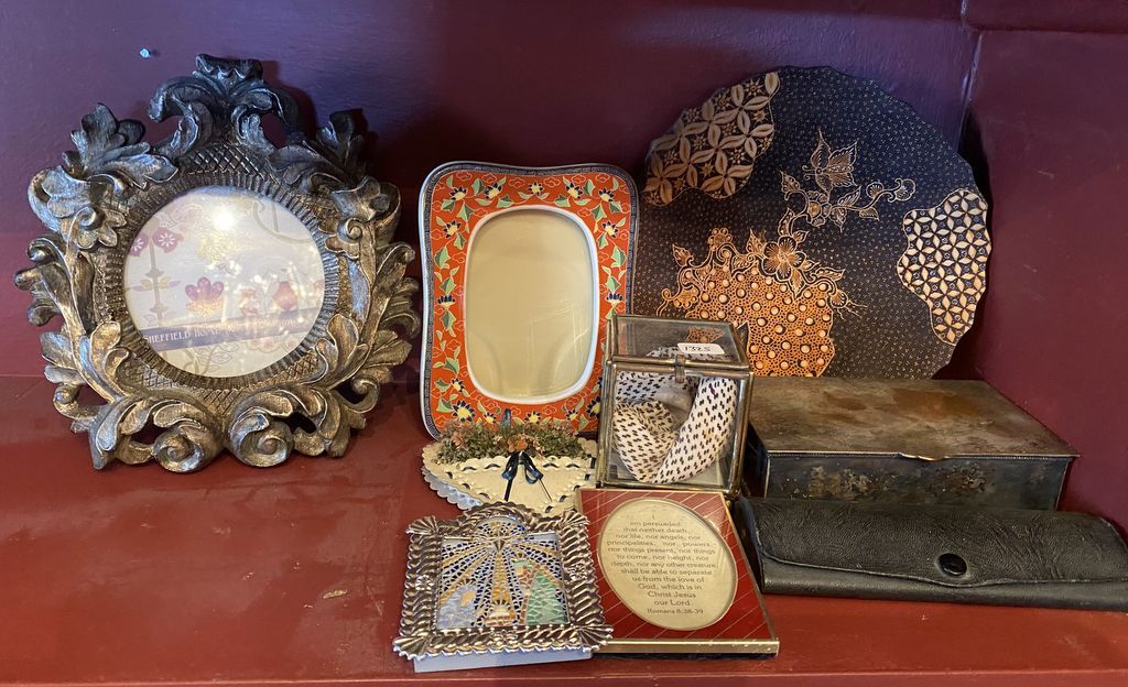 Collection of Picture Frames, Plate, Metal Trinket Box, and Glasses, Location Library Collection of Picture Frames, Plate, Metal Trinket Box, and Glasses, Location Library