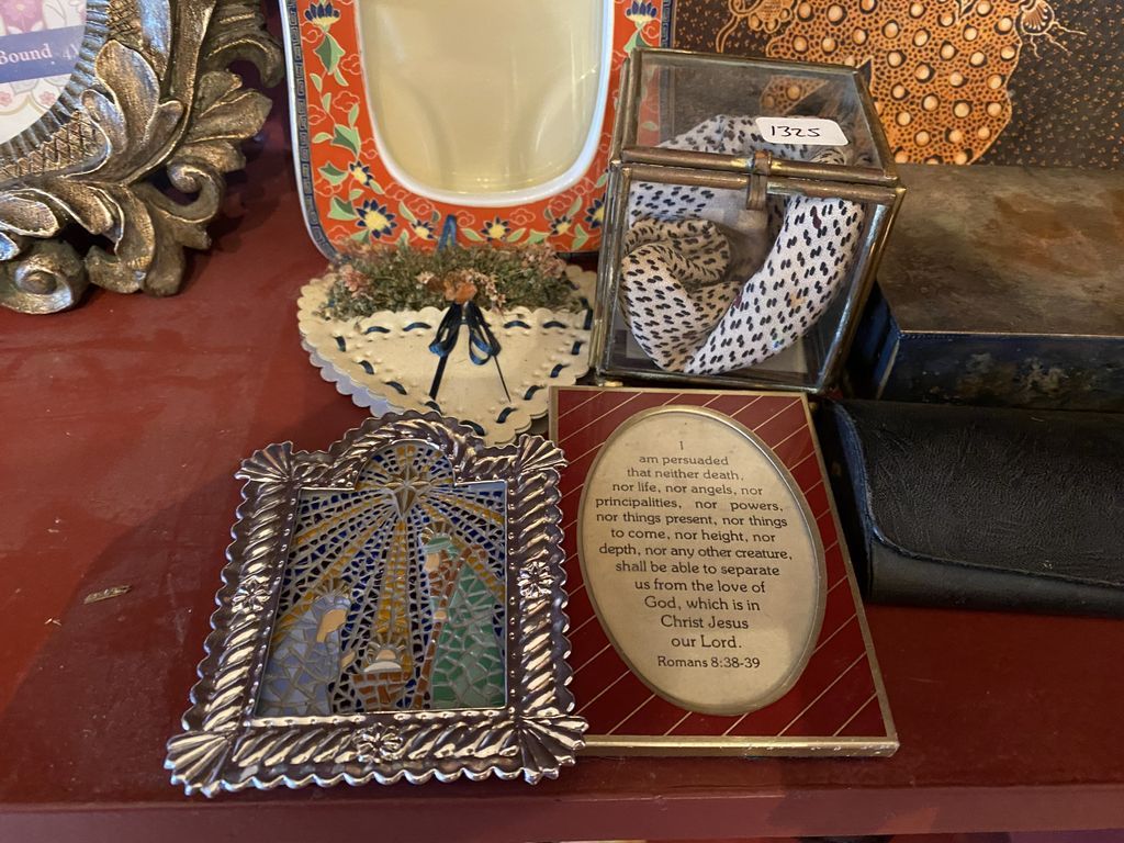 1325 Collection of Picture Frames, Plate, Metal Trinket Box, and Glasses